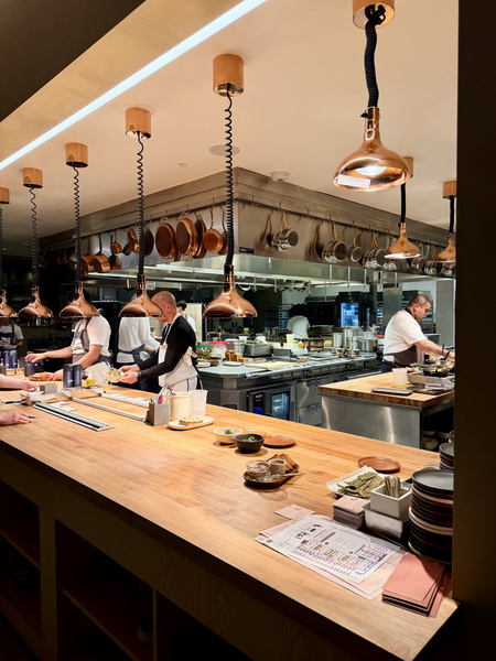 這天我們提早大約一個星期左右訂位,服務生安排我們坐在窗邊可以欣賞海灣大橋的夜景。餐廳內的設計相當優雅,以淺色木頭以及奶油色系為主,開放式的餐廳可以看到廚師使用木火烤料理,以及各式備菜與擺盤。入口處的吧台區空間也相當舒服,很適合在等候座位的時候先來此小酌。