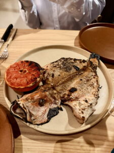 主菜其中一份我們點的是火烤菜單中的烤全魚,一整條帶頭烤魚帶皮拉開,附上一罐熱騰騰的苦艾酒接骨木花醬汁,旁邊有一顆烤葡萄柚。