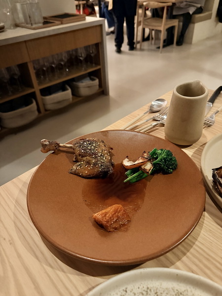 另外一份主餐點的是燒烤油封鴨腿,以五香粉、泡菜、亞洲梨以及日式香松調味。不過鴨腿滿小一根,上面撒上芝麻旁邊附上青花筍,這道整體相當普通。