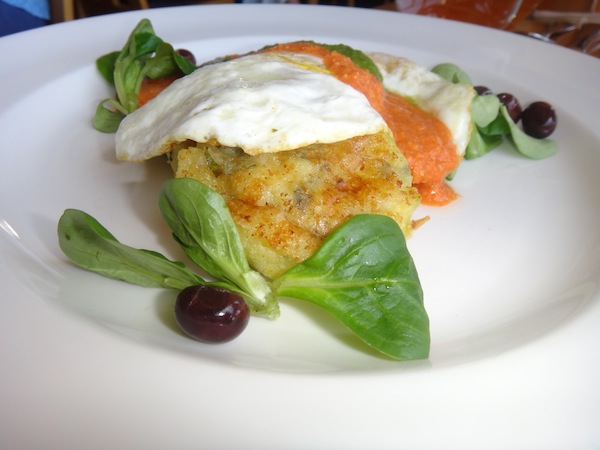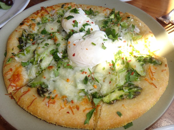 其次,主餐還有馬鈴薯糰子(gnocchi)、普羅旺斯比薩(Provencal Potato Pizza)、馬鈴薯餅(Yellow Finn Potato Griddle Cakes)。Gnocchi是傳統義大利麵食,用麵粉或馬鈴薯粉加水與蛋揉成一個個小糰子,類似中國的貓耳朵。 加了香濃起司和大量蔬菜的馬鈴薯糰子口感新鮮,雖然稱不上完全美味卻也挺可口的。尤其因為加了大量松子,香氣滿分。普羅旺斯比薩賣相極佳,在鋪滿大量蘆筍、Asiago起司比薩上放一顆水煮蛋,一上桌頓成為焦點。切下第一刀那鮮黃蛋汁四溢,令我食指大動胃口全開。最後,介紹griddle cake。Griddle 餅類似美式早餐的薄餅,不過因為主要原料是馬鈴薯,所以顯得樸實,帶點田園風味。