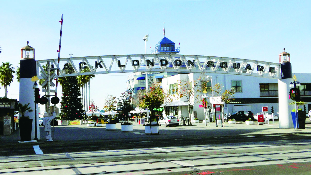 傑克倫敦廣場(Jack London Square)位於Oakland市區Broadway街南端的海港碼頭處,緊鄰著北邊的中國城。主要包含了Amtrak 火車站、前往San Francisco的接駁碼頭和假日農夫市場。這裏早期是捕魚海港和貨運港,從第一街到第五街曾有許多罐頭工廠和貨物批發中心。但後來因沒落,許多工廠在關閉後已改建為時興的閣樓,即為California州特有的樓中樓公寓,附近也有許多新興的商店。