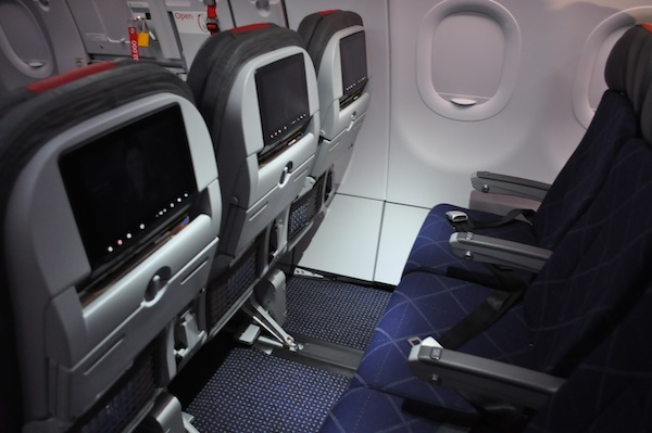 The main cabin is outfitted with 36 Main Cabin Extra seats, which feature an extra 6 inches of leg room, and 36 standard Main Cabin seats in rows of 3 by 3. All seats are equipped with universal AC power outlets and USB jacks. Main Cabin Extra flyers also receive early boarding privileges. All Main Cabin Extra and Main Cabin customers will be able to enjoy full complimentary in-seat entertainment through March 31, 2014. After the complimentary period, guests will have the options of complimentary content, pay-to-access packages, or pay-per-view movies. All purchases made inflight can be paid for with credit card, as no cash is accepted.