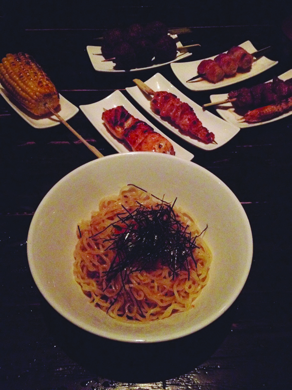 天天點了豚骨拉麵,湯底選用上等豬骨熬至烹調而成,味道香濃。醇厚的湯頭搭配Q滑有勁的日式拉麵再加上入口即化的肉片,實在堪稱一絕! 友人點得日式涼麵也不遑多讓,冰涼爽口的麵條淋上特製的醬汁以及小粒的飛魚籽,搭配得恰到好處,色、香、味面面俱到。我們一口接一口的吃不知不覺就吃得一乾二淨了!說到這裡,各位讀者是不是天天一樣還覺得不夠過癮呢!別著急,還有烤串呢!