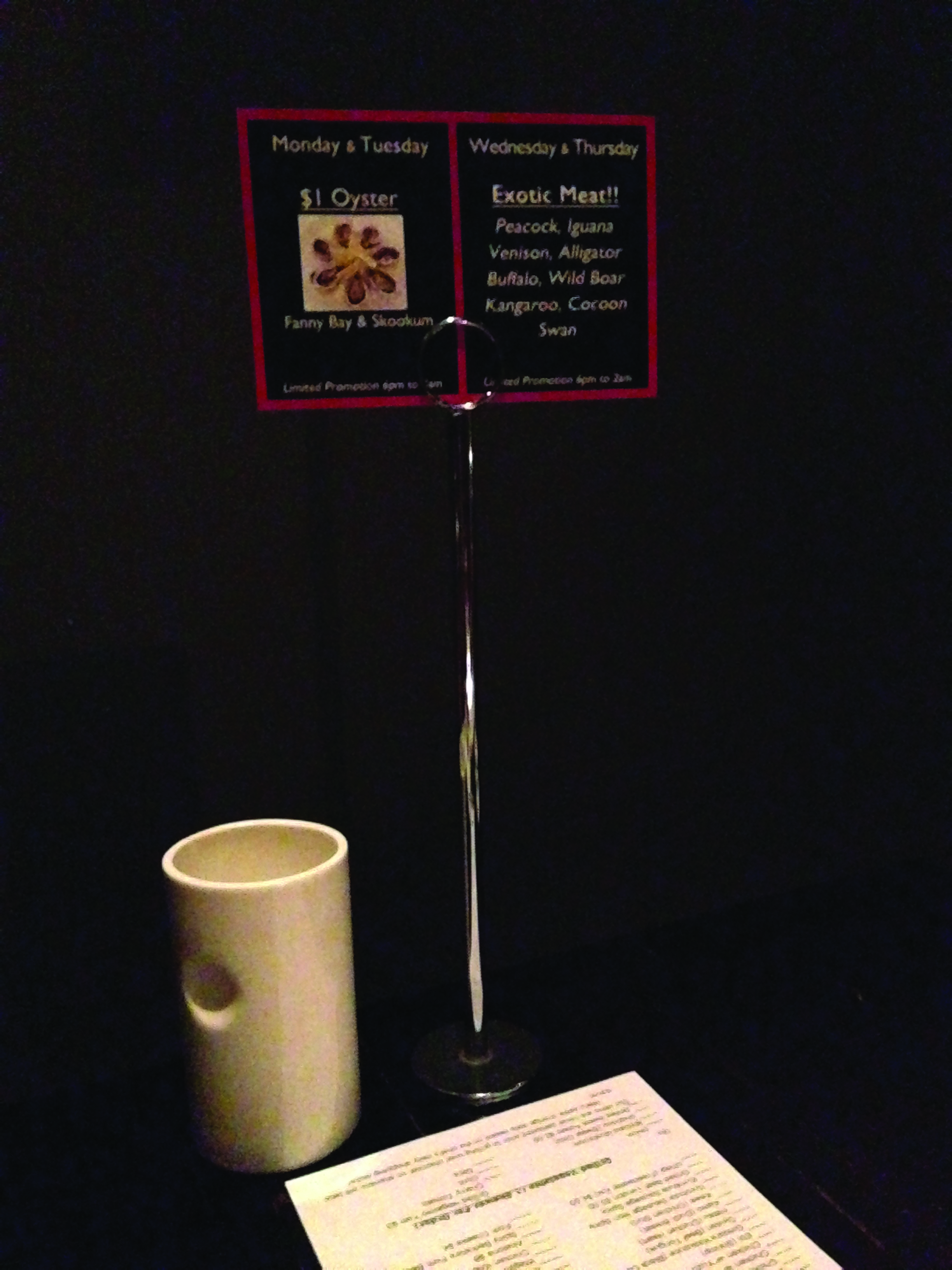 另外, Mokutanya 也有一些限時的優惠活動喲!像是週一、二(6:00 pm – 2:00am)新鮮牡蠣一顆只要一塊錢,但是每次最少要點六顆。而週三、週四(6:00 pm –2:00 am)有賣一些特別的野味,其中包括:孔雀、袋鼠、野豬……等等,任君挑選,等著各位讀者們去嚐 鮮。除此之外,天天還要告訴各位讀者一個好消息!每天晚上