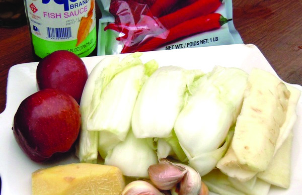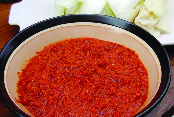 好了。現在把辣椒粉、魚露、蒜瓣、生薑、梨塊(或蘋果塊)統統放入打汁機,打成濃稠的辣椒醬,調料就備妥了。別問格格該放多少鹽——鹽擱得少,泡菜偏酸一些;放多了就比較咸。請按自己的口味發揮創意吧。反正大白菜也不貴,試兩次就明白了。
