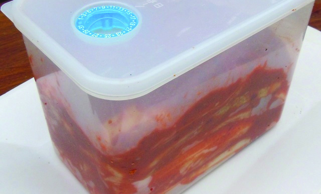 2)醬料的秘密——朝鮮泡菜和四川泡菜不同之處,就在於四川泡菜是清漬——只用鹽水;而朝鮮泡菜是用辣醬醃漬的。而這個辣醬的調製,有它的訣竅:第一,辣椒粉。最好選擇韓國超市裡賣的做泡菜的辣椒粉。這種辣椒粉很紅,做出來的泡菜色澤紅艷,但不太辣。如果用其他辣椒粉代替,就沒那麼亮麗了,而且辣死人!千萬注意。第二,氨基酸。朝鮮泡菜獨特的口味,在於它的醬料裡加入了魚露、蝦醬甚至牛肉湯之類的含氨基酸的調料,使得泡菜在發酵過程中,產生獨特的鮮香味(這有點像臭豆腐的發酵過程);第三,增稠劑。正宗的朝鮮泡菜,為了讓辣醬能較好地粘附在白菜上,他們還會把一些糯米粥調到辣醬內,增加粘稠度。格格用蘋果和雪梨打成泥,拌在辣醬裡,效果好像更好。