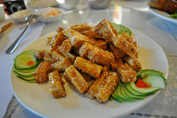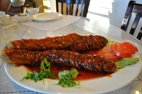 這道菜端上來的時候,誰也沒有認出它來。又粗又長放在盤子裡,好像一根生長茁壯的日本大山藥。第一個疑問就是,“到哪裡去找這麼大的茄子?”細一端詳才發現,原來茄子還是普通的茄子,只是切法獨特,再拉長了之後,裹上漿炸出來,個頭就不同了。
