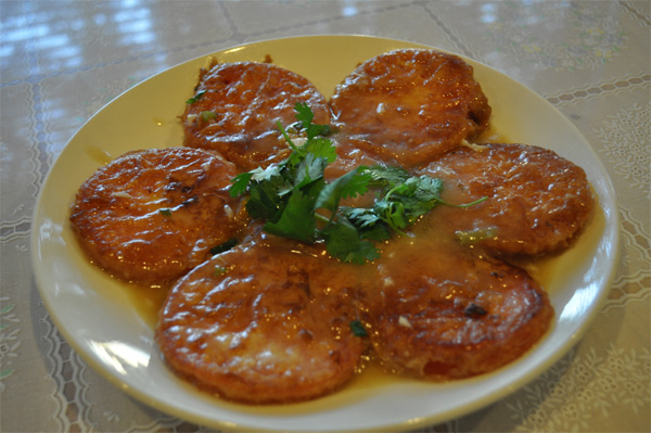 不過這道鍋塌番茄,我倒是第一次聽說。盤子端上來賣相挺漂亮。番茄切成圓片,裹了蛋汁煎好,擺成花朵的形狀,金黃中透出番茄的橘色,色澤誘人。咬一口,酸甜的番茄原汁濃郁,配上煎得味道酥香的雞蛋,香濃飽滿。番茄炒雞蛋基本上是每一個小朋友的最愛,鍋塌番茄的味道與其有些相似。但是,鍋塌番茄的蛋汁鎖住了所有的番茄汁液,有效地防止了番茄的營養流失。