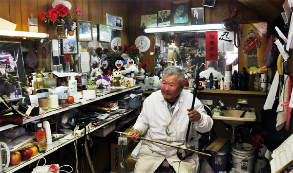 余先生經營著一間小理髮店,每逢有來自美國各地的遊客,他拉響二胡,都能賺到幾個硬幣。在那急驟輕緩、如訴如泣的曲調中,我相信余先生有過像阿炳一樣的人生煉歷,他的二胡同阿炳一樣,也拉出了滿腔憤懣和無限悲慟,也拉出了激昂的吶喊和深沉的思考。