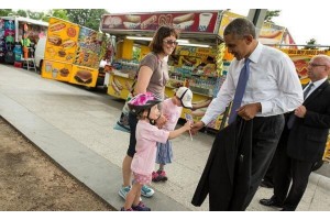 一輛紮染T卹販賣車前站著了一群年輕男女,其中一名男子看到總統大感興奮,喊道:「奧巴馬!Woo!」總統回答說:「你們好嗎?」男子表現得更為興奮,開始大叫一些愛國言語:「美國!自由!和平!希望!和慈善機構!Woo!」