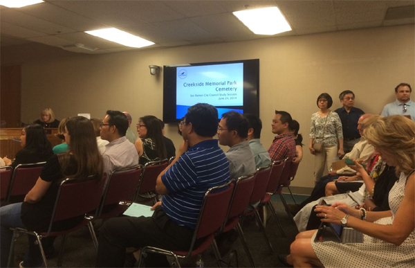 期待已久的關於在San Ramon City東部Tasajara Valley建立大型墓地的市民公聽會終於於6月24日晚上7點在San Ramon市政廳如期舉行。來自三谷多個城市的多族裔居民將會議廳擠得人山人海。很多人沒有座位,只能靠牆站著;有的干脆坐在走廊上;還有很多人站在門外聲援。這次會議還吸引了KTSF26中文電視台,Contra Costa Times等當地英文報紙等媒體的參加。華裔社區在這次反墓地的積極推動者姚建先生的倡導和組織下,派出強大陣容出席會議。