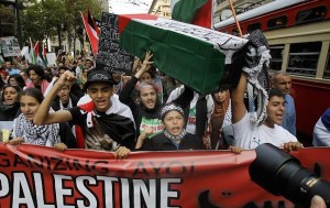 數百名示威者,包括阿拉伯資源暨組織中心(Arab Resource & Organizing Center)和阿拉伯青年組織的成員,約於下午3點在The Embarcadero的渡輪大樓聚集進行抗議。氣氛大致平靜有序。