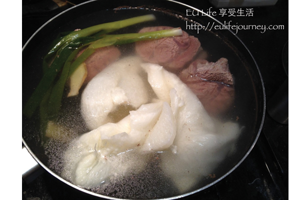3. 煮一鍋滾水放入蔥,薑,和一匙米酒,接著把切好的大塊牛腱肉下去川燙約10分鐘