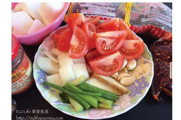 6. 把薑,蔥,蘿蔔,番茄,洋蔥,蒜頭都切片切段切塊準備好