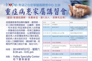 「希望之心安寧醫護關懷中心」為支援那些重症病人的親屬,特別籌辦「重症病患家屬講習會」。 這個講習會邀請得腫瘤科、心臟科、胸腔科及腦神經專科醫師,聯同護理師及社工師現場主講,專門研討如何照顧晚期癌症、心臟病、肺病及失智症或阿茲海默症的病人。還會介紹預立醫療自主計劃,及詳盡解說照護者的自我照顧等;讓照顧重症病人的家屬能掌握正確及適切的資訊,協助病患親人做合宜的決定。