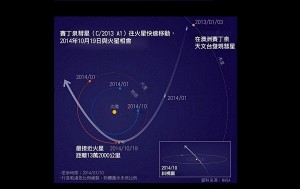 照片是在美國中部夏令時間今天清晨5時07分拍攝,編號C/2013 A1的「賽丁泉彗星」(Siding Spring),則是在今天下午2時27分(台北時間20日凌晨2時27分),以20萬3000公里的時速掠過紅色火星,兩者最接近時距離約13萬9500公里,還不到地球與月球距離的一半。