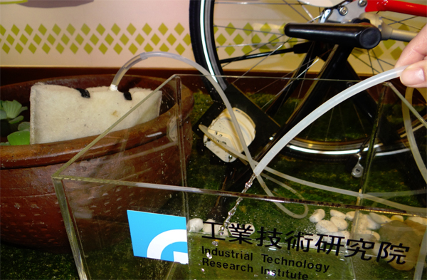 只要裝上腳踏車淨水模組套件,就可以讓一般的腳踏車變成淨水器,當腳踏板驅動車後輪時,輪胎帶動抽水模組,即可進行抽水及過濾的動作,淨水模組則採用不織布粗濾及不織布微過濾薄膜(可視原水條件增加水處理程序),可有效濾除水中細菌與濁度,變成飲用水,操作有趣又實用,特別適用於缺水或水質不佳的偏遠地區。