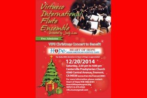 成立於2008年的Virtuoso International Flute Ensemble (VIFE)將於12月20日星期六下午2:30於佛利蒙市舉辦聖誕長笛演奏會,與社區愛樂者提前共渡耶誕佳節。由長笛專業音樂老師Judy Lam女士指導的VIFE,是由一群不分族裔、純因愛好長笛的青年愛樂者所組成。此聖誕演奏會一方面是提供學生一個表演機會來服務社區,另方面也希望透過與會者的愛心捐款來幫助希望之心安寧醫護關懷中心籌募創辦基金。希望之心安寧醫護關懷中心(Heart of Hope Asian American Hospice Care)是北加州南灣地區新成立的非營利安寧療護機構。創辦人龔振成表並希望之心擬於2015年初向加州政府申請安寧療護執照,以實際服務本地華人和亞裔生命末期病人及其家屬,為他們提供全人、全家、全程與全隊的醫療照護及關懷。