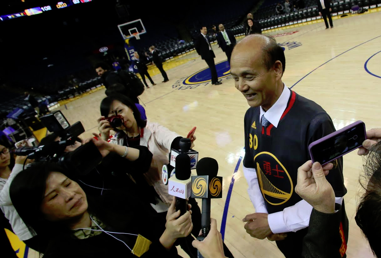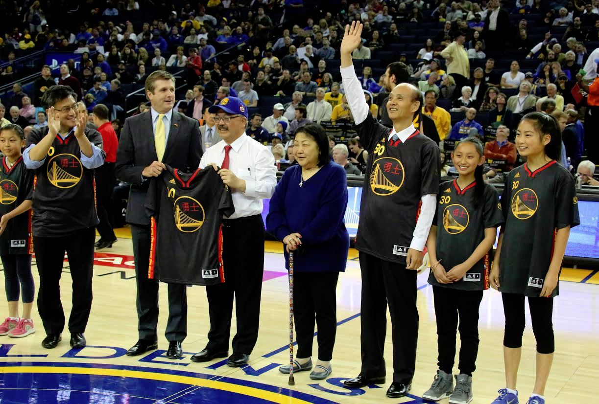 到賽場中央,向他們贈送了勇士隊的中文球衣。