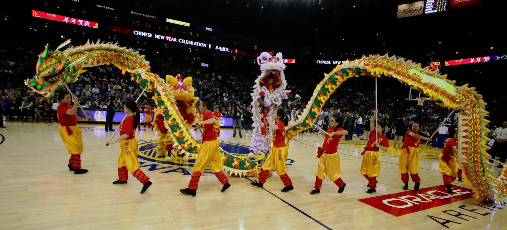 3月4日在奧克蘭的甲骨文體育場美國NBA常規賽三藩市金州勇士隊主場迎戰密爾沃基雄鹿隊的比賽,並與在場2萬多觀眾共慶中國新年。勇士隊球員穿上為中國春節特別設計的戰袍上場,胸前的金門橋隊標與 「勇士」中文字引人矚目,球衣兩側還印有富有中國元素的紅黃花紋及羊年圖案。