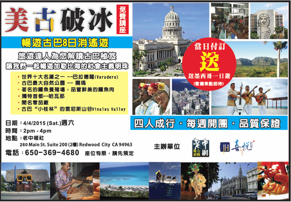 為了讓灣區老中旅遊愛好者,多了解古巴,老中地方新聞與喜悅假期聯合舉辦這次免費座談會,解讀古巴,這個令人神秘向往,卻獨樹一幟的國家 – 加勒比海的社會主義明珠!喜悅假期並推出了一個暢遊古巴八日逍遙遊。讀者可以對該這項新推出的八日逍遙遊提出問題。凡當日付訂簽約讀者,在去古巴的同時,可以免費獲得一天墨西哥一日遊的旅程。