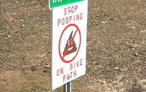 這條自行車道豎起了兩塊標誌牌,上面寫著「Stop pooping on bike path」(別在自行車道上大便)。並且不是,這不是向寵物發出的訊息。