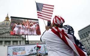 週日的San Francisco市民中心廣場上,數以百計的披國旗、塗彩繪的足球迷聚集在一起,為世界杯女子足球總決賽的美國隊加油。