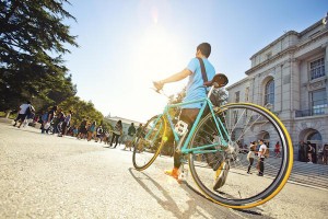 研究生Sandra Harpster騎她爸爸的舊自行車,因為她的自行車在一次她學習到深夜後被偷。