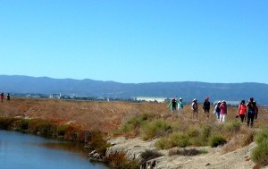 在去山景城海灣公園區的路上,我們先經過了谷歌總部的園區和一個很大的戶外劇場,然後穿過一個高爾夫球場,才找到那停了好些小船的碼頭。由那兒大家一面聊天,一面沿著一條沼澤邊的小路走到海灣的邊上,然後沿著原路回到碼頭。根據個人體力的不同和趕到公園的先後,大約有一半人走完全程。同樣的,在兩週後去南灣盡頭的Alviso海灣公園時,也只約有一半的人走完那近九哩路的全程。