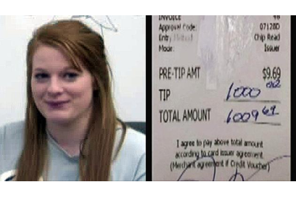 在東德克薩斯的一個餐廳,一個獨自用餐的客人給一個18歲的女服務員留下一個大大的驚喜-1000元小費。