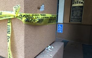 Concord警方週日對警察局正門遭到槍擊事件展開調查。正門有子彈擊中造成的剝落現象。