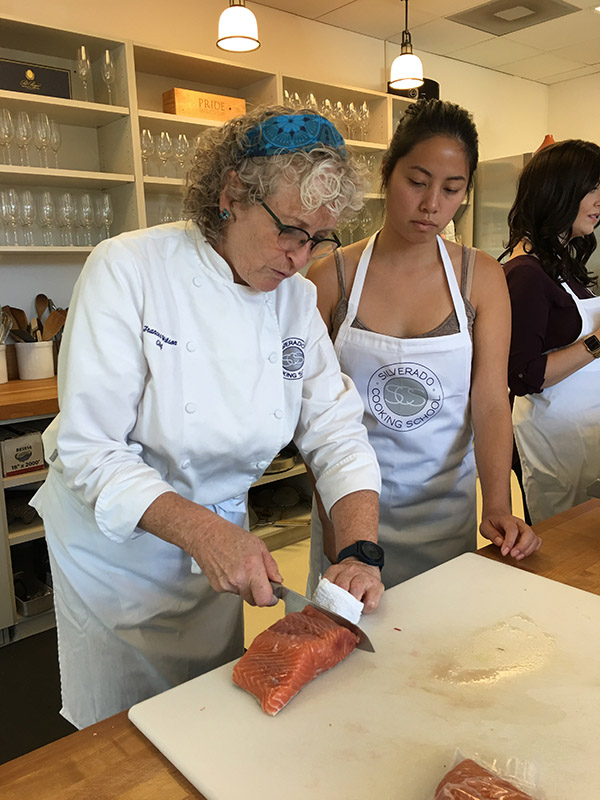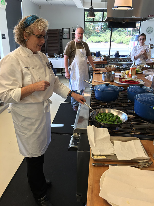 我們上網找了一家烹餁學校 Silverado Cooking School 。那天的課程叫做 Farmer”s Market Class,早上十點大廚在農夫市場和烹飪教室所有報名的學生集合。廚師是 CIA 畢業的學生,也在米其林餐廳工作過,但是她比較喜歡教學,所以開了這一家烹飪學校。她和農夫市場的攤販都很熟,帶著我們一家家的選當天最新鮮的蔬果,並且免費品嚐。我們認識了許多以前都沒有見過的蔬菜和水果,她也很尊重我們的意見,問我們想吃哪一種菜,我們今天便做什麼菜,一切都很隨和。