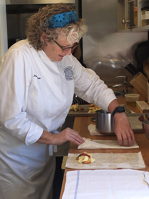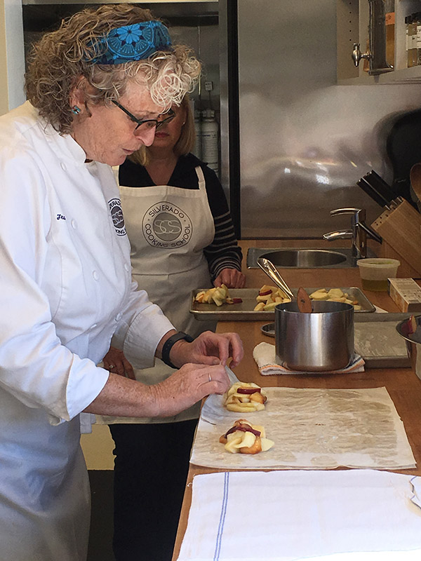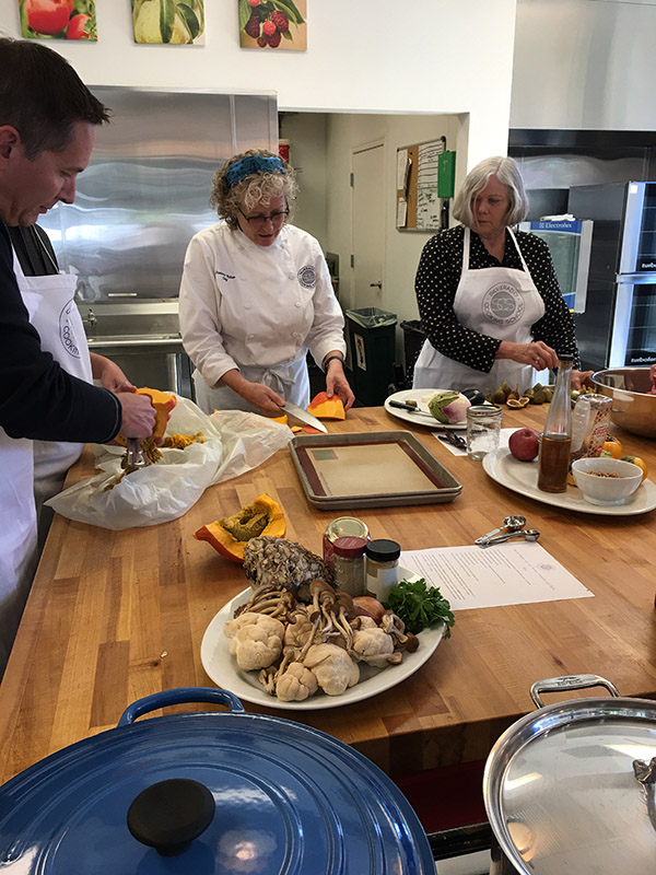 選完了菜我們便各自開車往烹飪學校去,學校內的大廚房另外還有一位二廚和一位洗菜、切菜的洗碗工。今天的行程從頭到尾是四個小時,十點集合兩點結束,節目是做一頓豐盛的午餐。這一堂課有十二個學生參加,我們分為四組,一組做湯: Roasted Pumpkin Soup with Harissa, Mushrooms and Herbal Yogurt,一組做沙拉: Persimmon and Pomegranate Salad with Arugula and Capricious ,一組作主食:Salmon Filets wrapped in Swiss Chard leaves with Catalan Relish,一組做甜點:Apple Strudel with Yogurt Ice Cream。