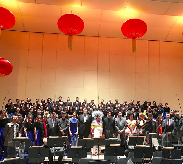 週五下午,大家聚集在史大的音樂廳裡同交響樂團再練習了幾次,再 由蔡教授親自到後台指點後,於當晚登台表演(圖三),並首次欣賞 到那幾位名家的歌聲和台風。休息一天後,週日中午先同萬年青的歌 友們到南灣華僑文教中心,參加北加州中華耆英聯合會舉辦的新春聯 歡餐會,並登台唱了兩首老歌“我的中國心”和“台北的天空”( 圖四)。然後在雨中趕到在南灣一所社區大學的表演廳裡,再度合唱 這支樣板戲的曲子。也許我們都更加熟悉這套歌曲和交響樂團的節奏 ,所以大家可以更注意蔡教授的指揮,一起發揮上山打虎的勇氣。在 演出後的合影之外(圖五),大家又紛紛同那幾位歌唱名家,尤其那 位帶領我們殺上威虎山的青年京戲演員傅希如合影(圖六)。