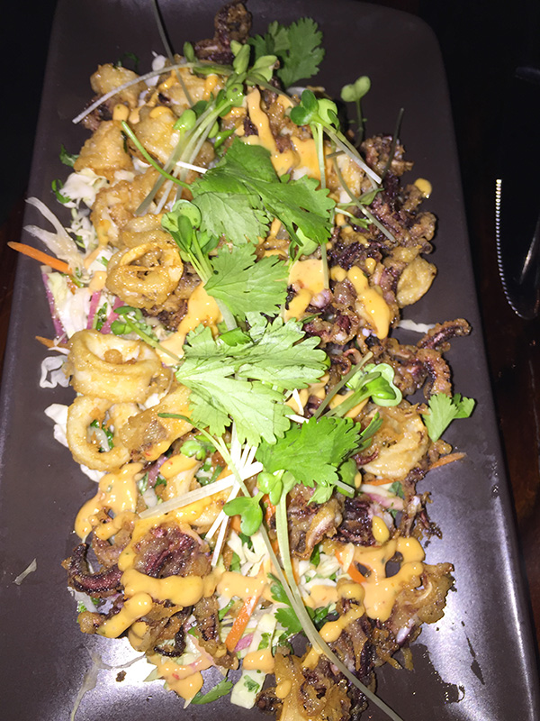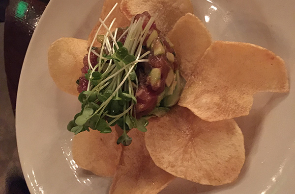 先上來的是 Tempura fried Monterey Calamari ,甜不辣魷魚,其實在很多海鮮店都吃過酥炸魷魚,但是此地烹調的方式不一樣,魷魚上面淋上店家特製的醬料,下面鋪著蔬菜,吃起來像沙拉、十分可口!我們要侍者每道菜一樣一樣上,才可以慢慢仔細品嚐。第二道前菜上的是 Tuna Tartare on homemade potato chips 生吃鮪魚新鮮自然是不在話下,而更好吃的卻是自製洋芋片。洋芋片吃起來一點也不油膩,而且比一般的洋芋片厚,我們很想請侍者再加一盤洋芋片,但是想想後面還有好東西於是就此打住。