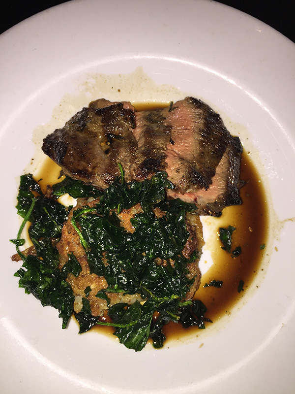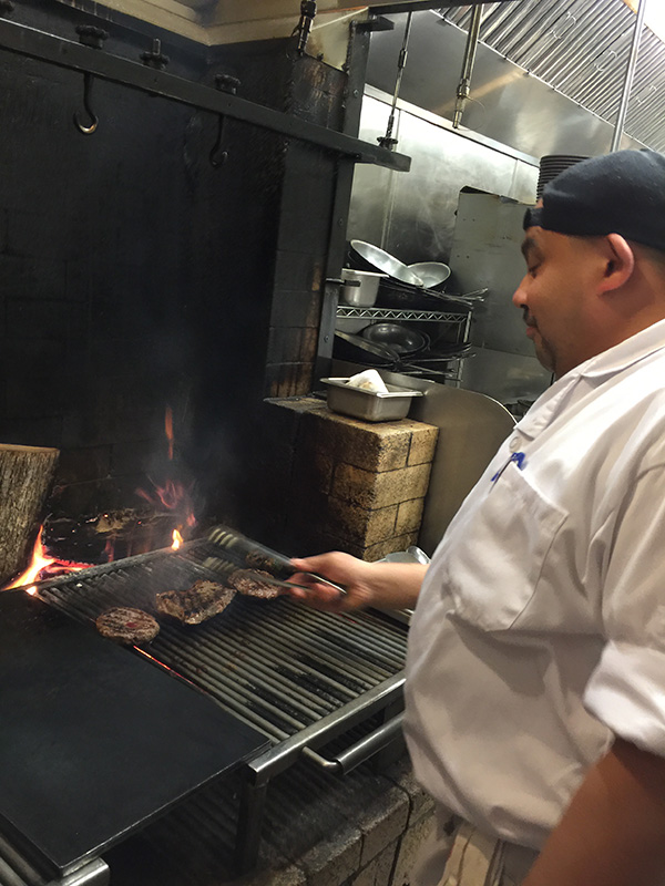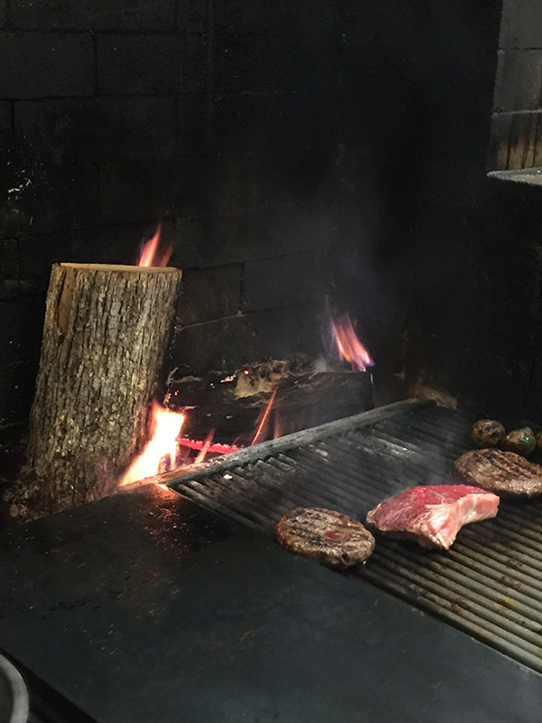 餐廳分為兩個部分,一個是前廳,旁邊有酒吧,後廳則是一個陽台中庭。而中間是廚房,我們選擇坐在陽台中庭。經過廚房時可以看到大廚在烤牛排、羊肉,旁邊有一塊木頭在燒。這年頭很少看到用木頭燒菜或是烤肉,我特地跑進去拍照以及詢問,為何有一塊木頭放在那裡燃燒?大廚說這樣的燒法才會讓烤肉有炭烤的味道,這倒是別出心裁。東瞧瞧、西看看都是好吃的菜餚,看樣子我們是不可能就點兩樣主菜而打住,好不容易預約到了,才擠進來怎可輕鬆罷休?於是決定點兩個前菜、兩個主菜、兩杯酒,這肯定是要超過四十元大關,吃了再說吧!