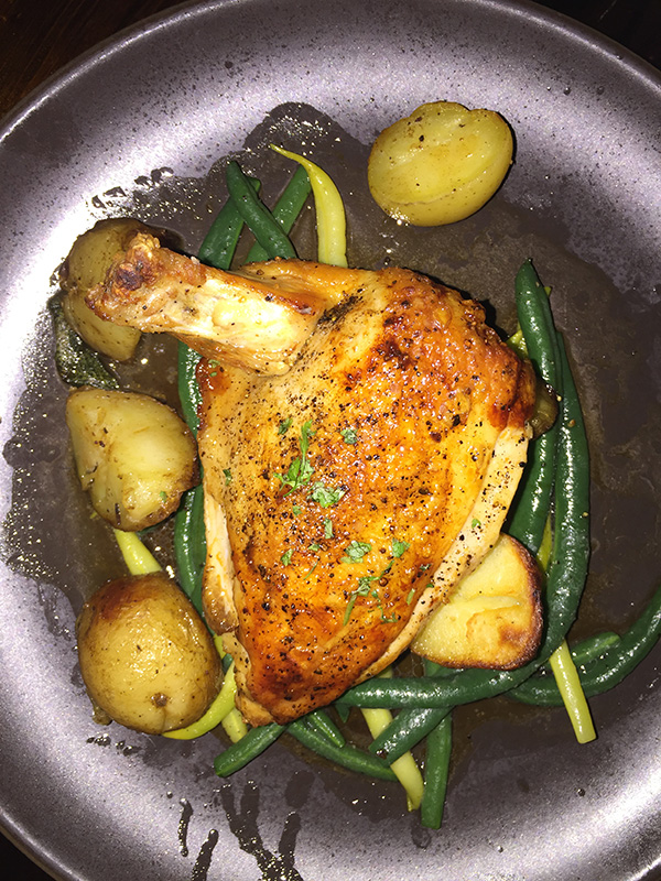 點的第一道主菜是Grilled Superior Farms Leg of Lamb ,有人說肉是羊肉最好吃,而烹調的方式則是烤的最好吃。所以今天這一道烤羊腿,可說是天上少有底下無雙,真的符合了米其林的標準,滑嫩鮮美,吃了還想再吃。第二道上的主菜是 Crispy Sonoma Chicken Breast,通常我上餐廳吃飯基本上是不點雞的,因為我覺得雞到處都有,自己做起來也很容易。可是在Yelp 裡面卻是推薦又再推薦,我便姑且試之。炸雞外脆內嫩,白肉當中的汁邊咬邊從口邊流出來,真的是比COSTCO的雞好吃一百倍。