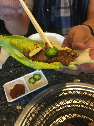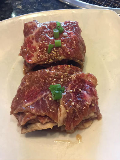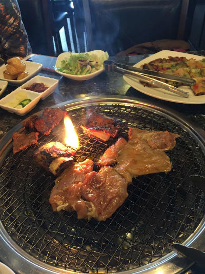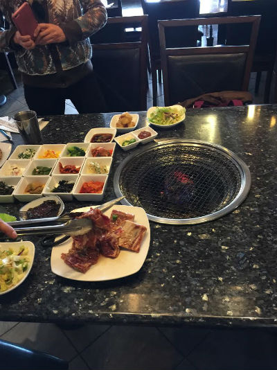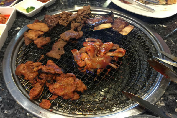 Banseok的吃到飽BBQ烤肉,每人收費只有$26.90,肉類選擇包括特級牛肉片,特級原味牛肉片,牛胸肉,肋眼肉,控肉,辣控肉,豬頸肉,雞肉,辣雞肉,小墨魚,花枝魷魚,牛骨。現烤現吃。食客每次可以選擇兩項肉類燒烤,吃完後再選兩項,直到全部嚐過,吃飽為止。桌子中央一個圓型的燒烤坑,火焰活躍,一舖上肉片就發出吱吱聲響,拿著肉夾稍做翻動,煙順著慢慢熟透的肉冉冉上升,鼻尖嗅出甜,辣,鹹的韓式燒烤肉香,伸筷一夾,送入嘴裏,再撥一口彈牙的紫米飯一起細嚼,穀香肉嫩,真享受。Stella一面幫著客人翻動烤肉,滿臉笑容的說”韓式烤肉傳統的吃法是從原味沒醃過的肉先開始,慢慢越吃口味越重。這就是為什麼我們的肉都分原味及醃製。”