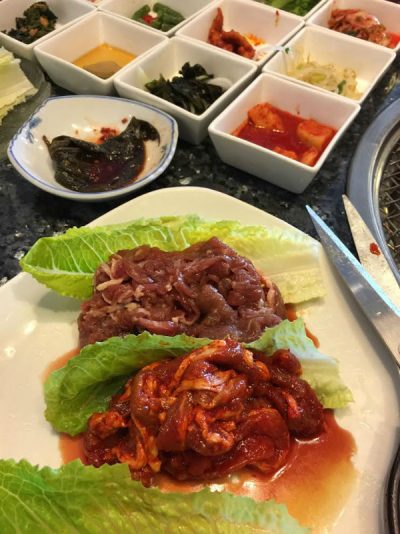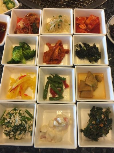 位於Dublin的Banseok Jeong韓式燒烤餐廳提供正式韓國菜譜,或隨意吃到飽的BBQ燒烤。多款前菜包括泡菜,醃蘿蔔,燙西蘭花,醃黃瓜絲,蘋果土豆沙拉,魚丸片,酸菜梗,酸甜海帶,豆芽沙拉,豆腐四季豆,醃紫蘇葉等。筆者最愛為蘋果土豆沙拉,蘋果丁清爽甜美,土豆丁煮得軟硬適中,拌上甜甜的美奶醬,十分可口。至於醃紫蘇葉,這可是Banseok的獨家名點。紫蘇葉,俗稱sesame leaf又稱perilla leaf,是韓國與日本料理常見的食材。Banseok的醃紫蘇,又鹹又辣,嚼起來葉面有點絨絨的,發出一股獨特的玫瑰花香。負責人Stella笑著說 ”這東西喜歡的人很喜歡,不愛的人一口都不肯吃!” “它很下飯,許多客人將葉子包飯吃。”所有的小菜吃完可以再叫。雖說是小菜,可是別小看它們的功能,當你吃滿一肚子的烤肉,就要靠小菜來解膩了。