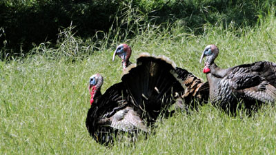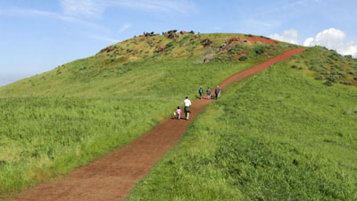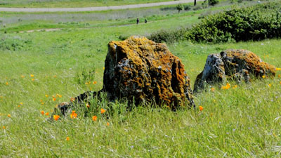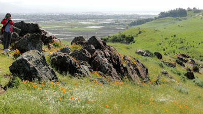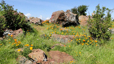 事隔約八年,想看不一樣的景色,我們在春暖花開時,就急著再上狼山公園。往北邊走,一上了小山丘就嗅出生命的小苗冒出綠意。果然是一片翠綠,有沼澤、山丘、野花,綠地及悠閒漫步在林蔭樹下嬉戲追逐的野生火雞,還有坡上岩石邊綻放著黃澄澄的罌粟花,耀眼極了!映入眼簾,恍如一幅幅的美畫令人陶醉。頓覺舒坦又清新,一掃冬天多雨又陰霾的心情,換來了無比的快樂。