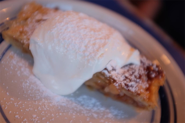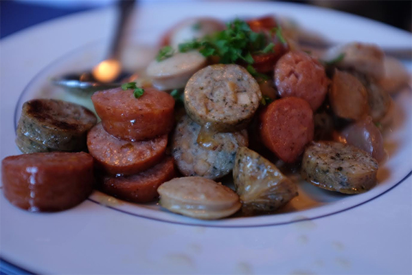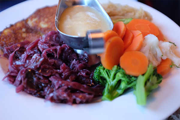 叫了一盤德國的各式香腸,算算大概有四、五種,也是配上酸菜,五顏六色,好吃又好看。另外再叫了一道 Brit 起士,熱呼呼、黏蒐蒐,可以拉得長長一條,入口時得要小心,不要燙著了。另外再叫了一盤各式德國蔬菜,其中最有名的就是醃包心菜,它是深紅色,很像 beets 。