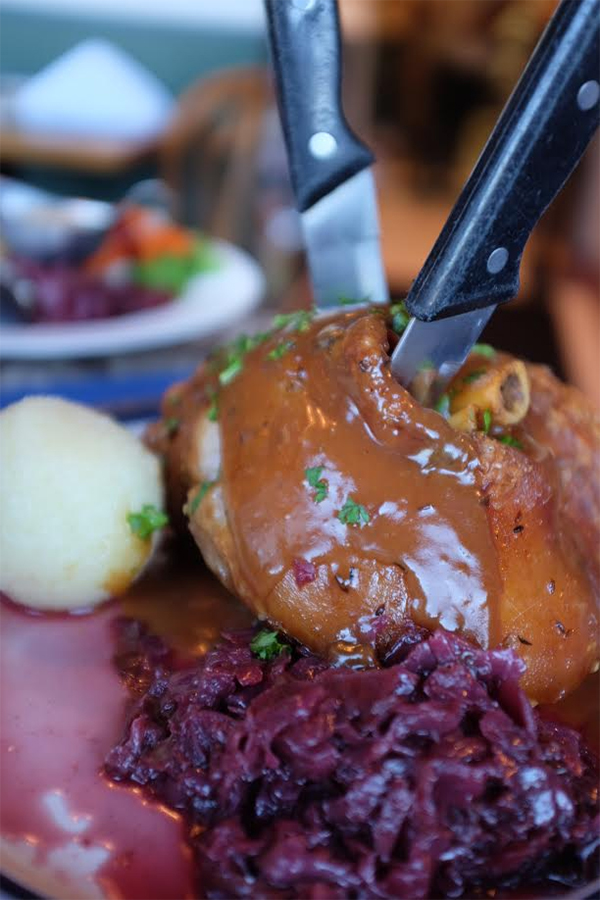 德國豬腳選用脂肪較厚的豬後小腿,經盬醃製後水煮或火烤,並佐以德國酸菜等進食。幾次去道地的德國餐廳吃豬腳,大大的一塊豬腳上桌時,上面都插著一把刀,十分豪邁。旁邊的配料就是有名的德國酸菜,非常的爽口。除了德國豬腳之外我們也叫了幾道配菜,也都是德國的傳統小菜。