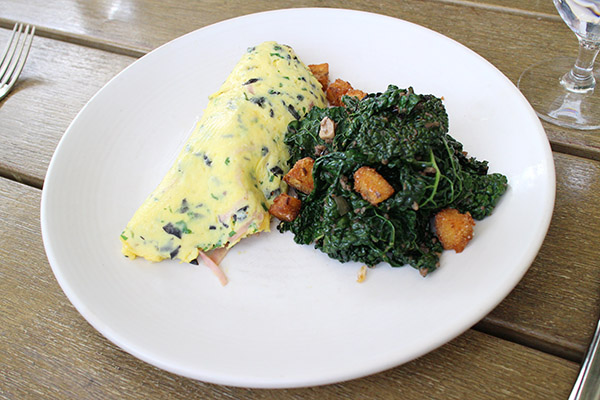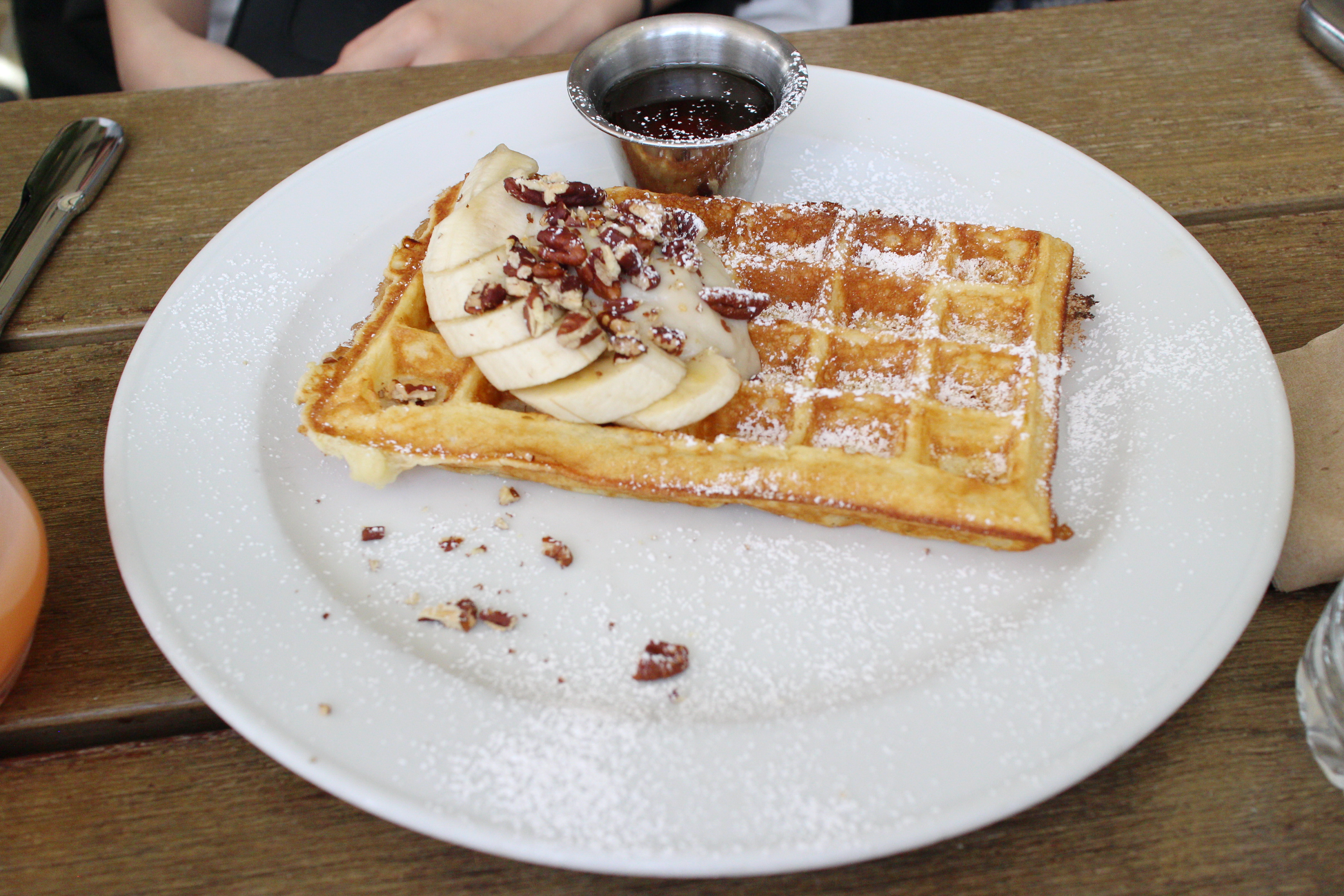 法式油封鴨腿佐酪乳華夫餅,是一道最有特色的早餐餐點之一。這道鹹甜搭配得宜,既美味又十分具有特色。香脆的華夫(waffle)注入酪漿(buttermilk),烘烤得奶香四溢,上面疊上一塊肥美軟嫩的法市鴨腿(duck confit),還有一顆蛋黃朝上的鴨蛋並點綴著鳳梨數片,一旁附上了楓糖漿。用香料醃透的鴨腿鮮香無比,鴨肉在鴨油和香料的浸潤中,形成非常獨特的風味,濃厚的滋味透過溫潤的鴨肉深入骨隨,讓人想把鴨骨都咬碎吸啜;華夫餅的口感鮮香鬆脆,與楓糖牛油的組合充滿鹹香意趣。如此豐富的餐點不僅滿足了想吃鹹食的味蕾,同時渴望甜點的胃也被滿足了。