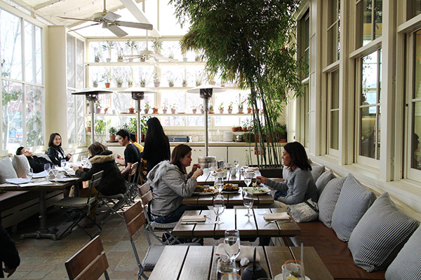從納帕市區悠然穿越谷地,沿著古雅的聖海倫娜 ( St. Helena) 市中心街道行駛,小鎮素有「納帕山谷主街」 之稱,兩旁琳瑯滿目的特色商店、藝術畫廊和浪漫的咖啡館,突然之間,一抹葱蘢綠意讓人眼前一亮。門前藤蔓爬滿白色的外牆,一座熊熊火爐為這片小花園增添了不少暖意。通過小小的木門踏入這座小花園,映入眼簾的是有著玻璃屋頂的溫室空間。木製座椅上點綴了條紋的椅墊與抱枕,一旁是燒著木材的火爐;另外一邊是一整面擺放著盆栽的透明玻璃牆,陽光恣意地從各個角落灑進來,帶來輕鬆舒適的融融暖意。
