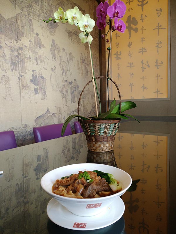 說了這麼多,洪師父的牛肉麵到底有什麼秘訣呢?我們一上來就品嚐了四種代表性的牛肉麵。第一碗就是他們的招牌牛肉麵:牛三寶,就是牛腱子肉,牛肚,牛筋三樣。這是得過冠軍的。麵條是獨家配方跟本地面廠合作,新鮮壓制。麵條筋度高,有韌性,口感彈牙。湯底是用純牛骨熬湯十幾個小時,再加上自己用紅蔥頭和蒜等炒了一個多小時的辣醬,最後配洪師父家獨門秘方湯包才得。洪師父對食材要求特別高,要新鮮,質量好,不用味精,以養生健康的清淡口味為主,降低用鹽量,讓食材本身的鮮度貢獻味道,不用再額外加很多鹽調味。