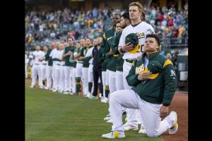 週六,Oakland Athletics接球手Bruce Maxwell在演奏國歌時單膝跪地行禮,這是一位Major League Base選手第一次做出這樣的舉動。在A’s對陣Texas Rangers比賽開始前,父親曾是陸軍軍官的Maxwell單