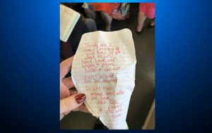 紙條上寫著:「現在有兩支槍指著你。如果你想活命,交出你的錢包+手機立即+不要轉身,小心。在你已經離開Civic Center前不要轉身+你將活命。」