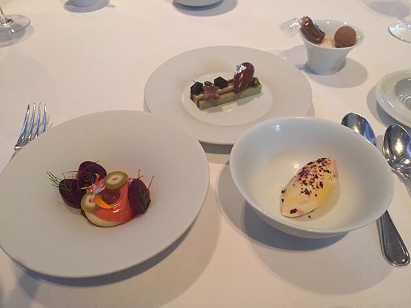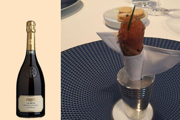 每道菜小巧精緻、不但色、香、味俱全外,更講究餐具瓷器的搭配,擺盤像藝術品美得無以倫比,真是視覺上的一大饗宴。每上一道菜都有驚喜的感覺,一小口一小口慢慢品嚐,真是人間美味,更體會出大廚對餐飲完美的要求。量少種類多提供客人可以同時品嚐多樣的佳餚。一道道的美食,讓您打開味蕾,意猶未足還想吃的誘惑。佳餚也要有美酒助興,我們點了一瓶 2009 Le Rêve Blanc de Blancs 的香檳,從不喝酒的我,覺得還很香醇。