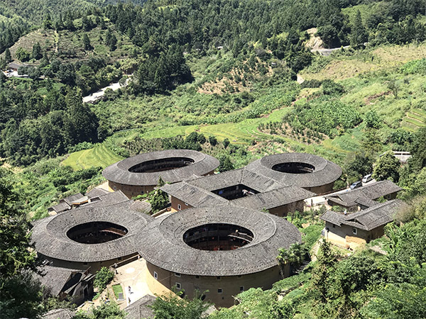 漳州南靖是福建省首批國家生態縣,其中最具知名度的是擁有15000多座的客家土樓,而”田螺坑”則是其標誌性的土樓群,根據導遊告知這個距今幾百年的歷史建築其實是由美國人發現而聲名大噪的,話說美國情報單位透過衛星上拍攝的資料驚現,在中國的福建南部深山中發現了四個類似核彈地下發射孔的裝置,立馬派出情報人員喬裝成觀光客夫妻,不遠千里而來探個虛實,剛到附近還看到這發射孔會冒出黑煙,但未見飛彈射出,立刻回報:此為核彈發射基地,但發射失敗!!上頭即命令繼續觀察,結果發現一天照三餐試射,餐餐失敗,這對觀光客放大膽子進去一探究竟,才發現其實是一群居民的集合住宅……土樓就此揚名天下!!姑且不論此事真假,但是,在逃難移居異地的困境中,更能凸顯激發先民的智慧及遠見卻是不爭的事實,土樓的設計主要在於防禦外人的入侵,以當時的攻城武器來說,土樓確實可以達到一定的防衛效果。