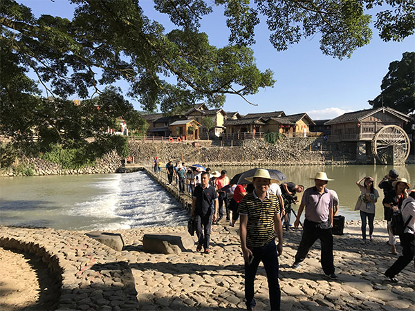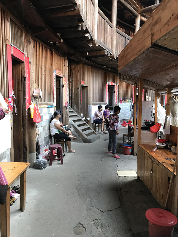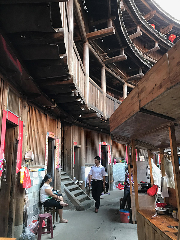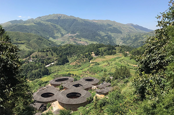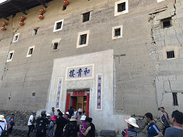 漳州南靖是福建省首批國家生態縣,其中最具知名度的是擁有15000多座的客家土樓,而”田螺坑”則是其標誌性的土樓群,根據導遊告知這個距今幾百年的歷史建築其實是由美國人發現而聲名大噪的,話說美國情報單位透過衛星上拍攝的資料驚現,在中國的福建南部深山中發現了四個類似核彈地下發射孔的裝置,立馬派出情報人員喬裝成觀光客夫妻,不遠千里而來探個虛實,剛到附近還看到這發射孔會冒出黑煙,但未見飛彈射出,立刻回報:此為核彈發射基地,但發射失敗!!上頭即命令繼續觀察,結果發現一天照三餐試射,餐餐失敗,這對觀光客放大膽子進去一探究竟,才發現其實是一群居民的集合住宅……土樓就此揚名天下!!姑且不論此事真假,但是,在逃難移居異地的困境中,更能凸顯激發先民的智慧及遠見卻是不爭的事實,土樓的設計主要在於防禦外人的入侵,以當時的攻城武器來說,土樓確實可以達到一定的防衛效果。